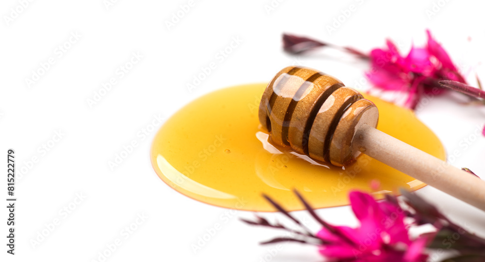Honey dripping, pouring from wooden honey dipper spoon, isolated on white background. Close-up. Healthy organic liquid honey spill, decorated with gaura flowers.