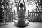 Rear view of young woman practicing yoga outdoors. Female stretching arms up in tropical vacation resort.