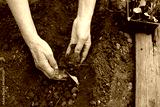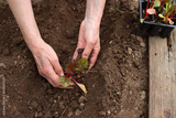 Detail of female hands transplanting colorful Chard plants in the vegetable garden
