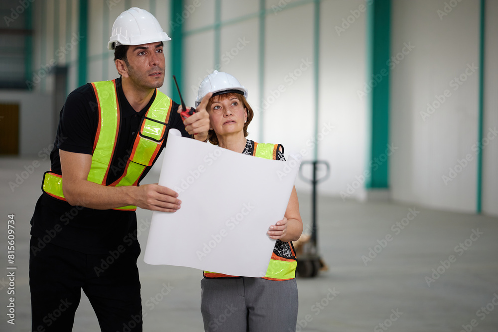 workers or engineers planning from work on blueprint drawing paper and pointing to something in the factory