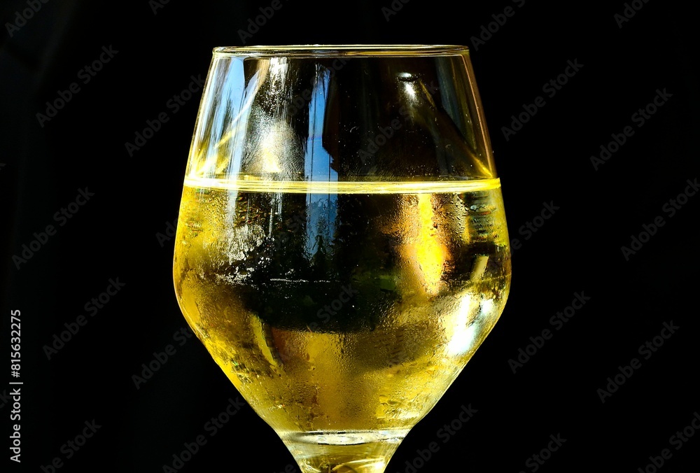Glass of white wine displayed on a black surface.