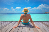 tourist in Maldives enjoying sea beach with turquoise water, vacation travel, woman in bikini and hat