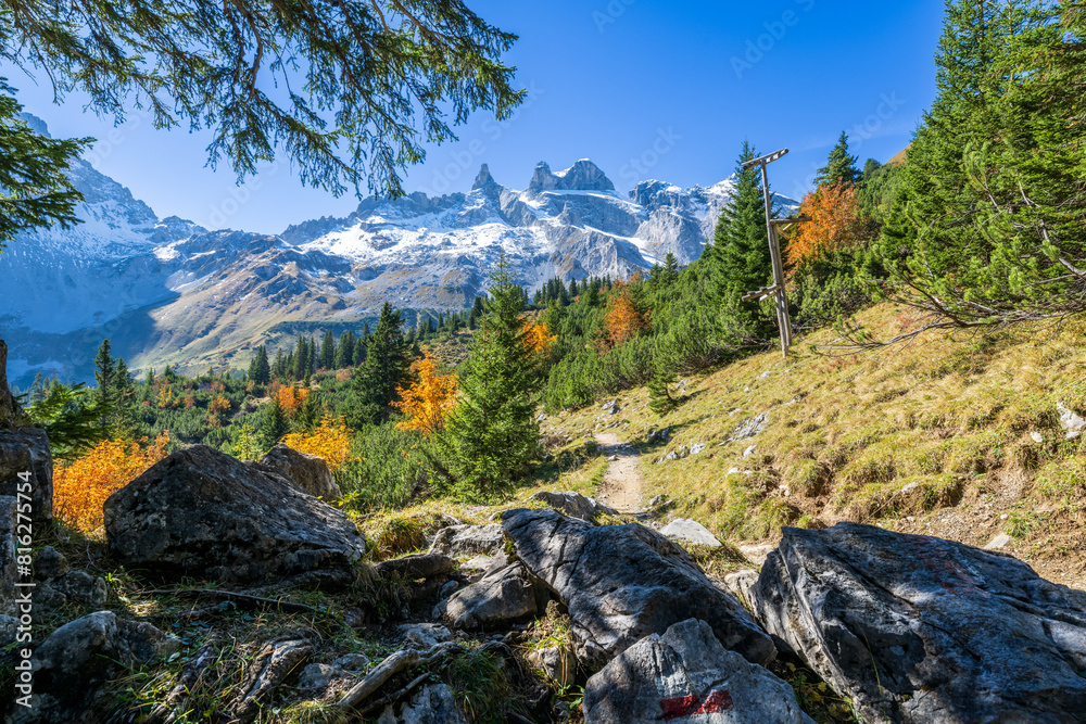 Golmweg mit 3 Türme, Gauertal, Montafon in Vorarlberg, Österreich
