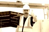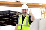 Portrait of happy smiling senior worker engineer foreman with safety vest and helmet giving thumb up at construction site. Elderly architect working at ground level of building site workplace.