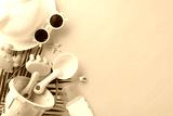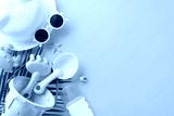 Summer beach playtime. Top-view shot of sand play essentials: bucket, shovel, sea crab mold, SPF cream, straw hat, sunglasses, seashell, starfish, palm leaf on yellow background. Copy space available