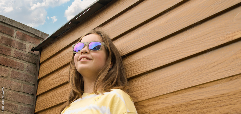 A girl wearing sunglasses and a yellow shirt is smiling at the camera