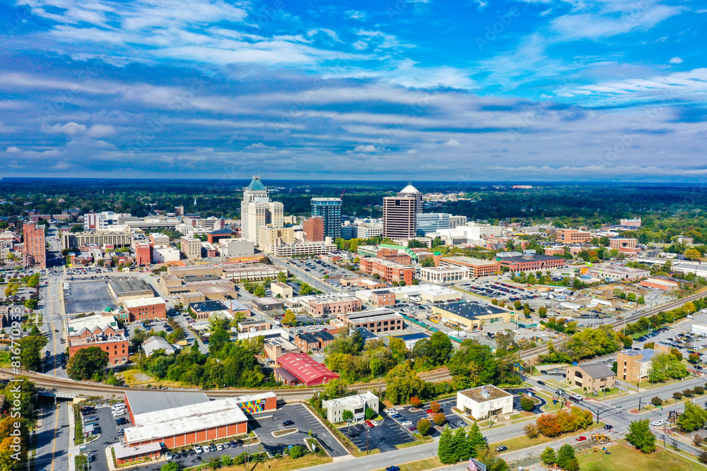 Aerial view of the city of Greensboro, North Carolina, showing the downtown skyline.