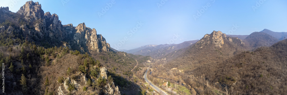 Panorama Armenia. Nature Dilijan region. Mountains in national park road passes at foot of mountain. Rocky landscape of Armenia. Panorama of Dilijan national park. Armenia landscape view from drone