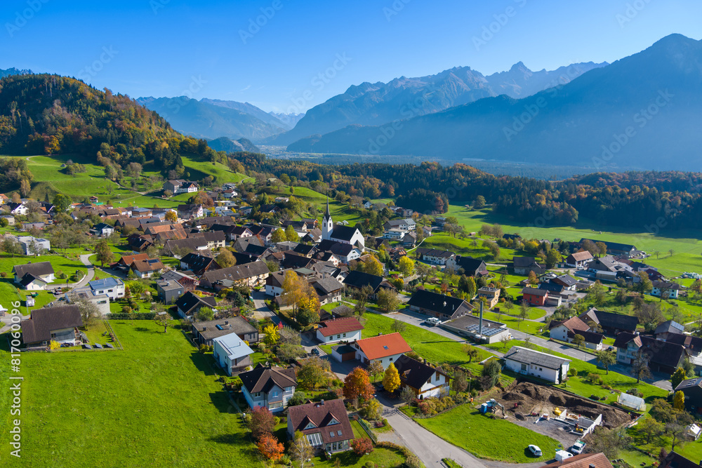The village of Düns in the Walgau Valley, State of Vorarlberg, Austria. Drone Picture