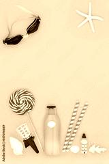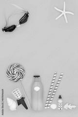 Summer vacation beach seaside accessories and decorations with suntan lotion and swimming goggles. Travel holiday fun in the sun vacation concept on yellow background.