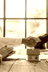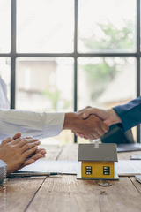 Home sales representatives shake hands and congratulate customers on their successful home loan financing. And on the table was a contract document with a house plan. Close-up pictures