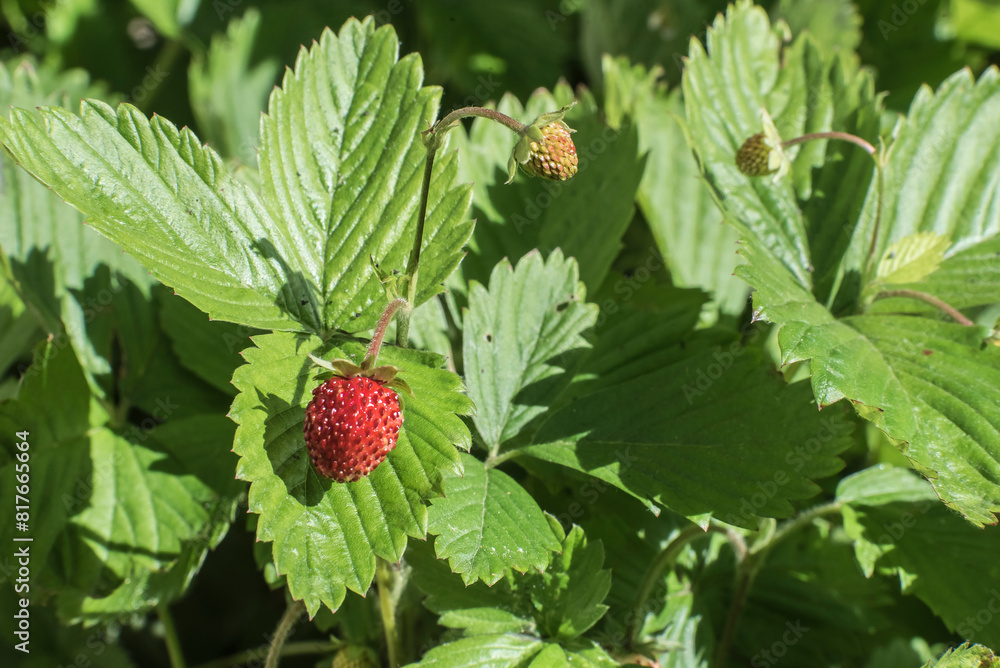dojrzewające poziomki na krzakach w ogródku w promieniach wiosennego słońca.