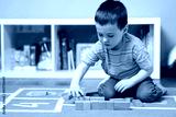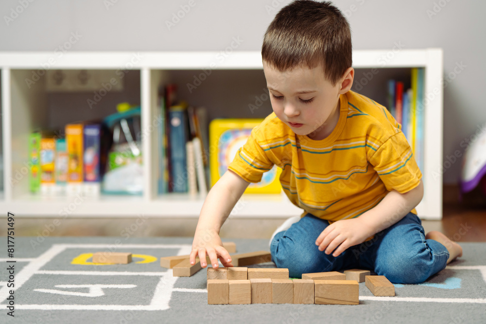 Little cute toddler boy three years playing wooden blocks in a home children's room. Educational toys for kids.