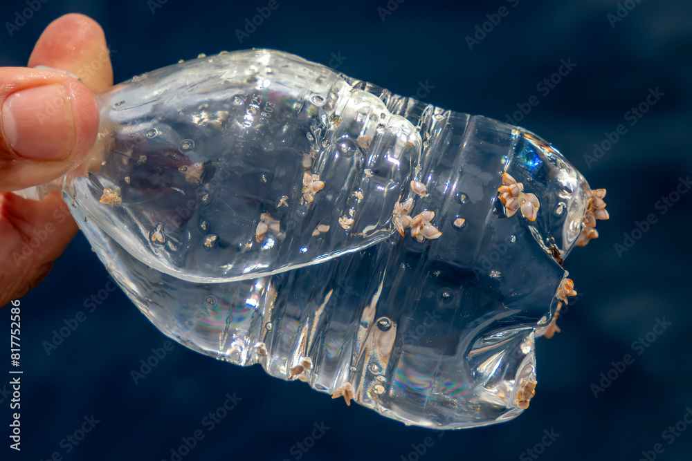 crab and goose barnacles on plastic bottle on sea pacific ocean Plastic waste ,environmental or pollution concept