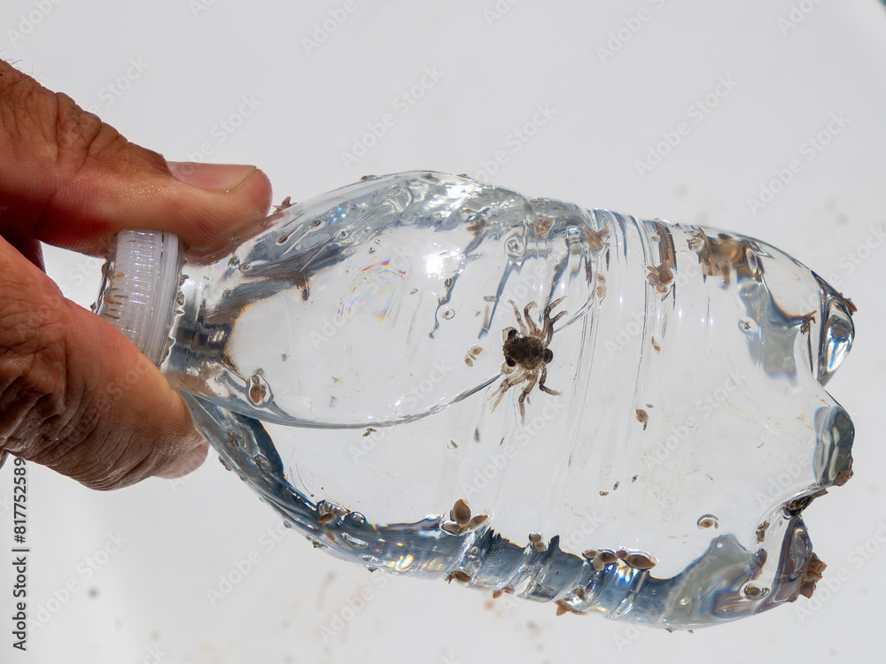crab and goose barnacles on plastic bottle on sea pacific ocean Plastic waste ,environmental or pollution concept