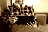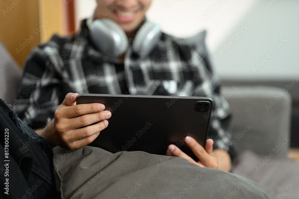 Cropped shot of man watching video using digital tablet and relaxing on couch in living room
