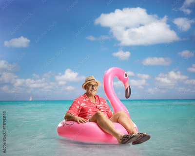 Mature man sitting on a inflatable flamingo rubber ring in the sea