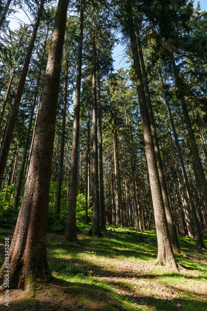 Sunlight filters through trees on woodland path, illuminating larch and grass