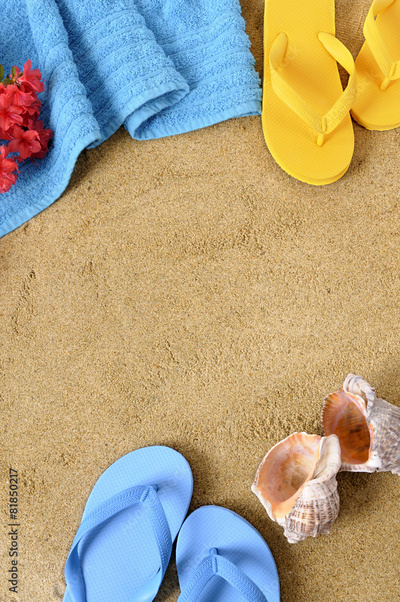 Beach background tropical with sand accessories and space for text copy summer holiday vacation photo vertical