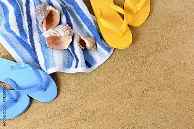 Beach background tropical with sand accessories and space for text copy summer holiday vacation photo