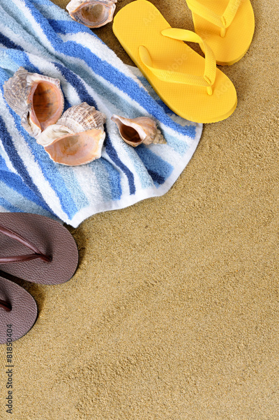 Beach background tropical with sand accessories and space for text copy summer holiday vacation photo vertical