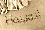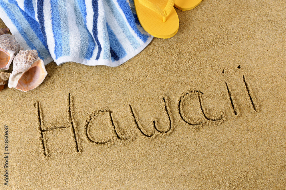 Hawaii beach word written in sand with towel and accessories writing text summer holiday vacation photo