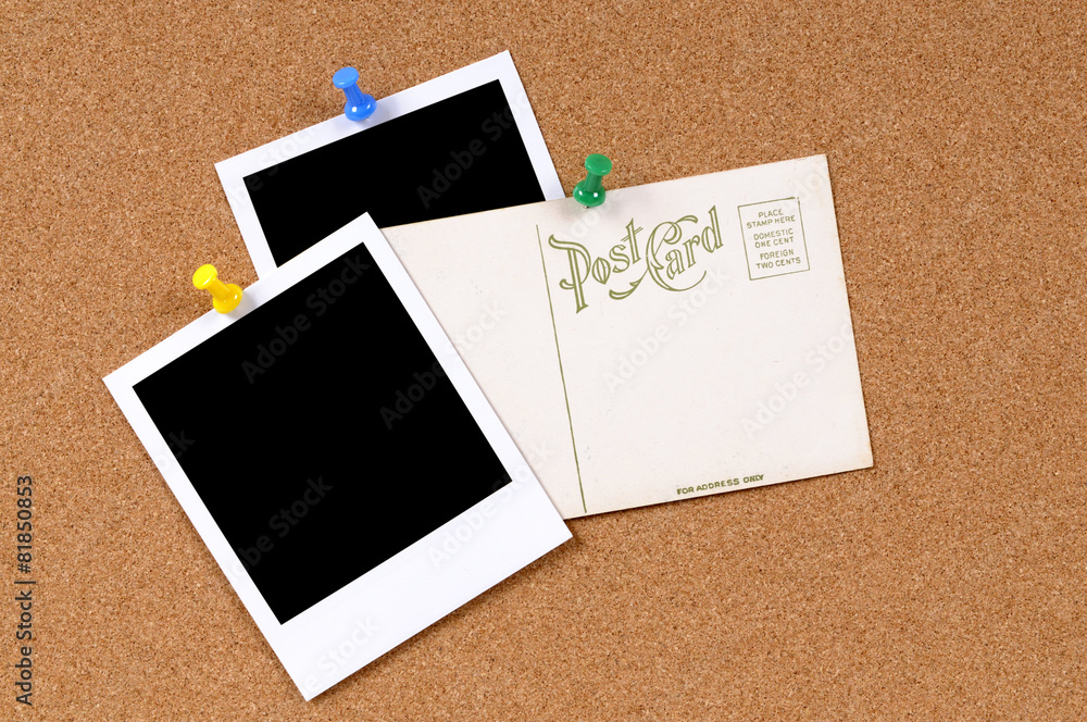 Old postcard or post card vintage retro pinned to a cork board background with two blank polaroid style photo frame prints