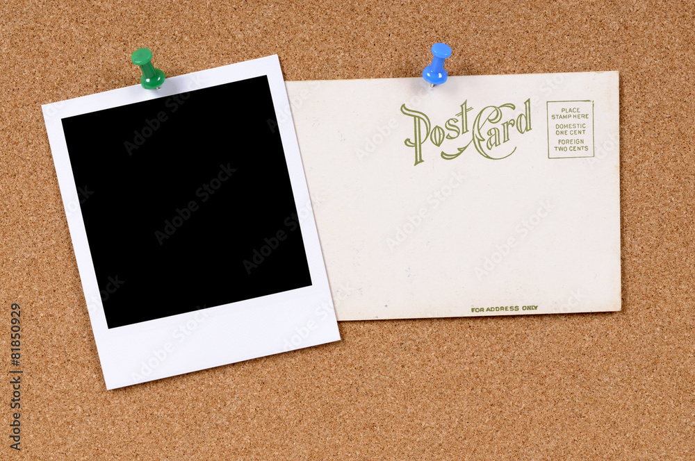 Old postcard or post card vintage retro pinned to a cork bulletin board background with one single blank polaroid style photo frame print