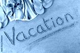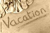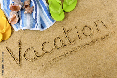 Vacation beach word written in sand with accessories writing text summer holiday vacation photo