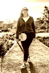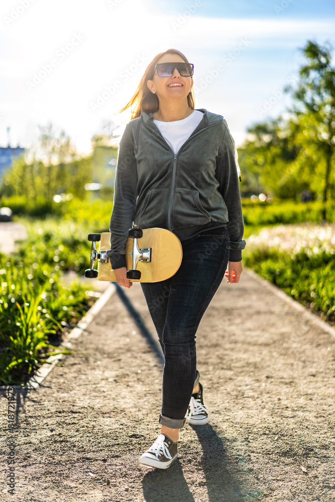 Young woman walking with skateboard in city park