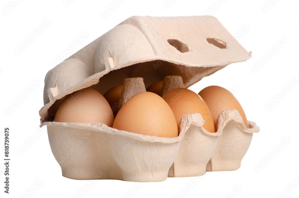 Box of brown eggs on white background isolation