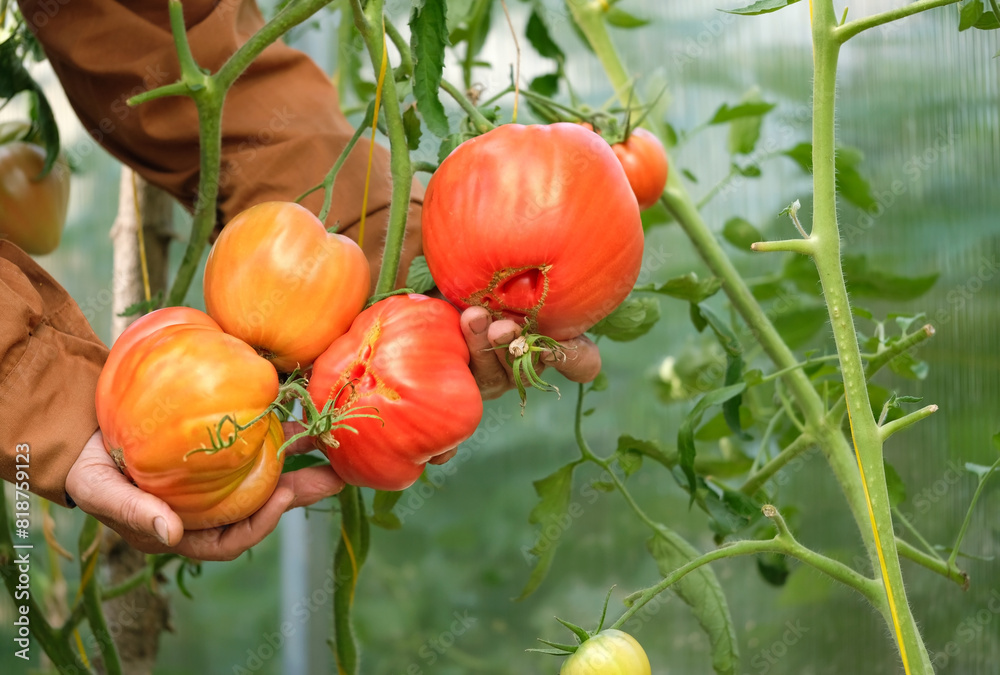 Farmers hands with ripe red organic tomato in greenhouse farming. picking harvest meticulous growth care. countryside agricultural bio and eco farming cultivation garden