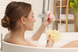 Woman pouring shower gel onto mesh pouf in bath indoors