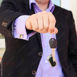 A man in a business suit holding key with remote control