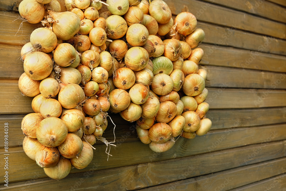 harvest of ripe onions plaited in pigtails to dry further, storage for winter. Bundles of onions hanging on wall of village house.