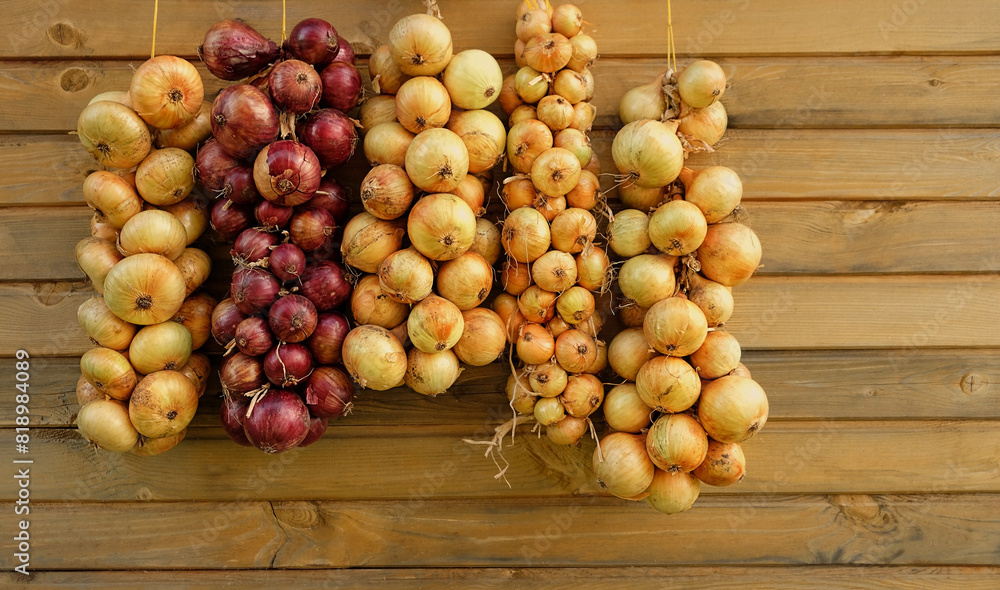 harvest of ripe onions plaited in pigtails to dry further, storage for winter. Bundles of red and yellow onions hanging on wall of village house.
