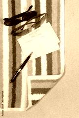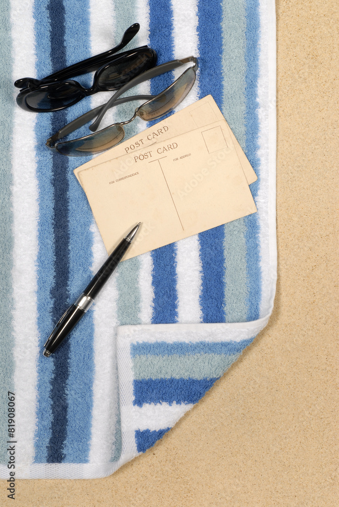 Old vintage retro postcard post card on a summer vacation tropical holiday beach with starfish sunglasses and seashell photo vertical