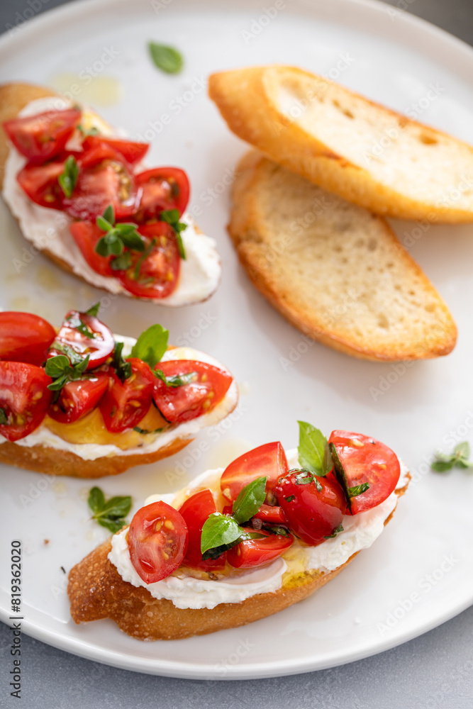 Fresh tomato bruschetta with olive oil drizzle