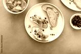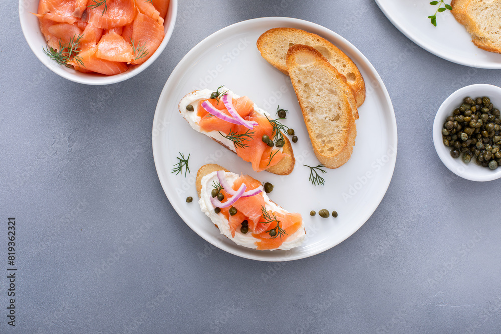 Making bruschetta with cream cheese, smoked salmon with toast and capers