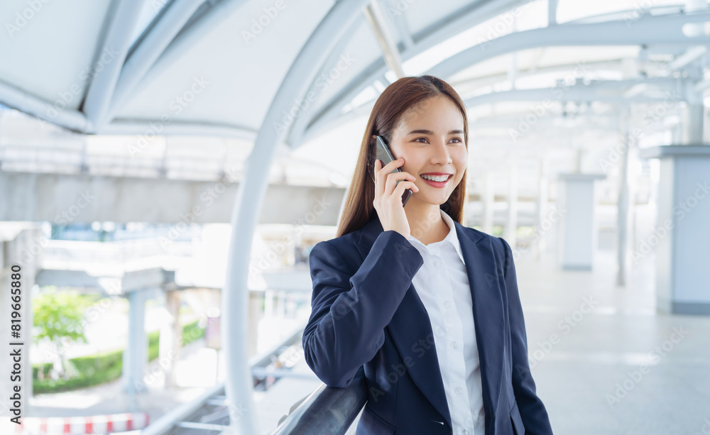 Smiling asian businesswoman talking on the phone while standing in front of modern business building, Concept of using the phone to communicate anywhere.