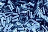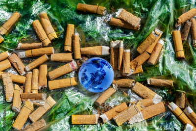 Human health concept. Lots of cigarette butts surround a crystal globe on a plastic bag on green grass. nature invaded by plastic and full of smoking