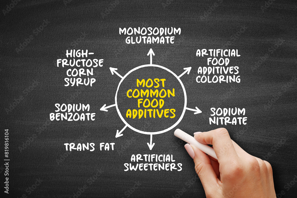 Most Common Food Additives (substances added to food to preserve flavor or enhance taste, appearance) mind map text concept background