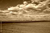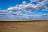 An expanse of tilled earth reaching to the horizon under a partly cloudy sky.