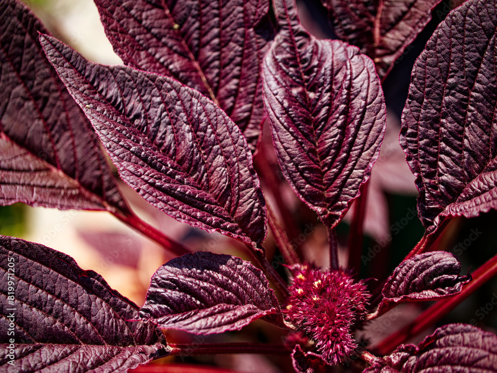 Vibrant red leaves in focus, with a soft backdrop, perfect for seasonal or botanical themes.