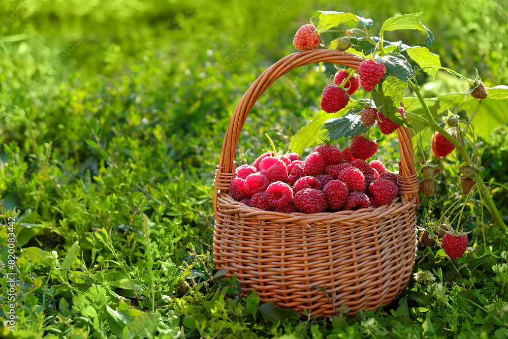 wicker basket with ripe red raspberries in garden, natural background. Fresh picking berries harvest. Healthy vitamin seasonal food. Summer season. copy space