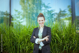 happy modern woman worker near office building in black jacket