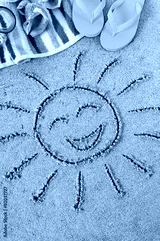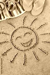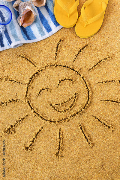 Smiling sun happy smiley face drawing drawn in sand with child hands on a tropical beach with seashells and accessories summer holiday vacation photo vertical