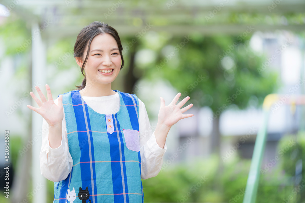園庭で手を振る保育士 先生おはようございますorさようならのイメージ 転職や採用求人に