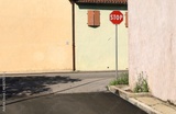 Stop traffic sign at the corner of two road. Building of different colors in front and by side. Urban background for copy space.