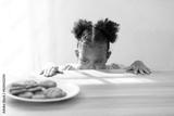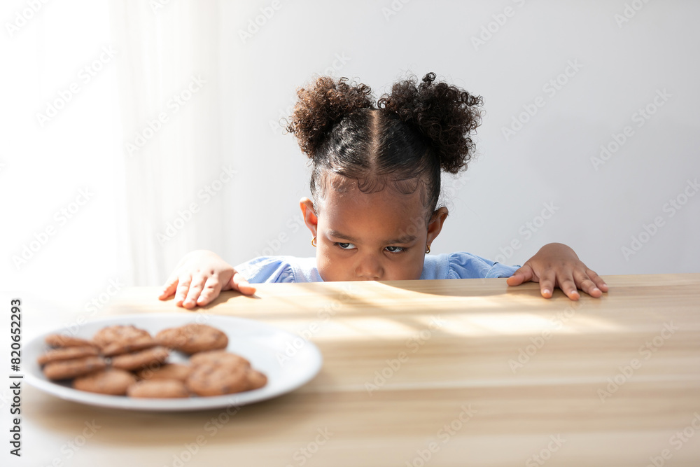 African child girl hiding and looking chocolate cookies or biscuit on dish from under the table
